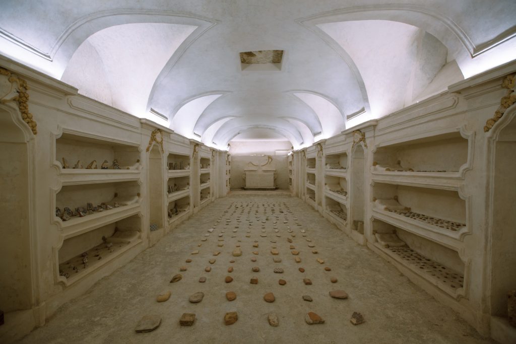 The space of the crypt contains elaborate niches arranged on three levels for the display of the bodies of the brothers, and extends below today’s Piazza Magione. A trap door leads to an underground chamber set aside for the drying of the bodies. With the advent of modern means of transport the Church of SS. Euno e Giuliano gradually fell into a state of neglect. Bombing in 1943 destroyed much of the complex, leaving it in a state of abandon. Restoration work was funded in the late 1990s by Comune di Palermo. At the edge of a large comunal square this former church invites to reflect on the long history of interdependency between religious and civic domains in Palermo.
