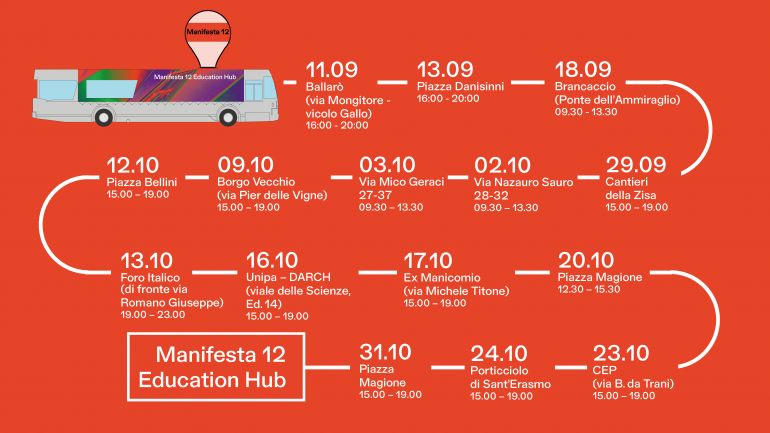 Education Hub is a project of Manifesta 12 Education Department made in collaboration with the University and Academy of Fine Arts of Palermo and the transport company AMAT. Education Hub is generously supported by DGAAP, the Contemporary Art and Architecture Department of the Italian Ministry of Cultural Heritage and Tourism.