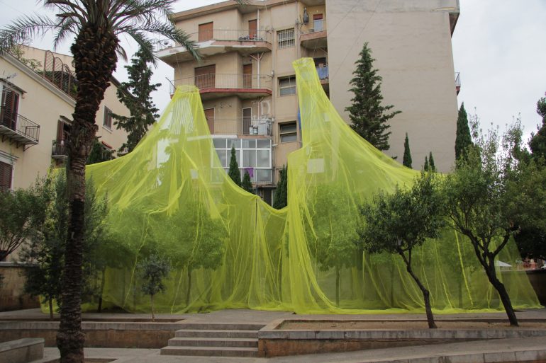 This garden, previously known as the Bay Leaf Garden, once featured a monumental bay leaf tree, uprooted in 1704. Today, the Giardino dei Giusti is configured as an open space surrounded by the remains of the city walls bombed in WWII, a space emulating the medieval Xirbe-Arab-Norman productive gardens created in abandoned urban areas or areas buried in decomposing ruins. Inside the garden stand seven citrus trees. Inspired by the traditional Jardinu Pantesco, unusual roofed gardens typical of the island of Pantelleria, the installation by the London collective Cooking Sections offers a contemporary reinterpretation of open-air shelters created to produce a microclimate, thanks to the breeze facilitated by their shade. At the same time, and in collaboration with agronomists from the University of Palermo, the project is monitoring the health of the trees throughout the period of Manifesta 12.