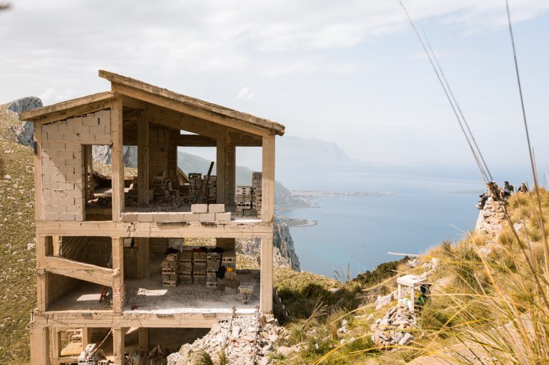 The architecture collective, Rotor, has realised an environmental intervention, Da quassù è tutta un’altra cosa (2018). Following the traces of human beings and animals, Rotor discover an ancient mountain path that joins the building complex to the Monte Gallo nature reserve. Close to the top, the collective transforms the concrete skeleton of an unfinished house into an observation point for breathtaking views. From high up, the disfigured hill thus becomes a device for healing, offering a form of relief from its long exploitation.
