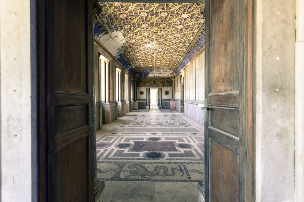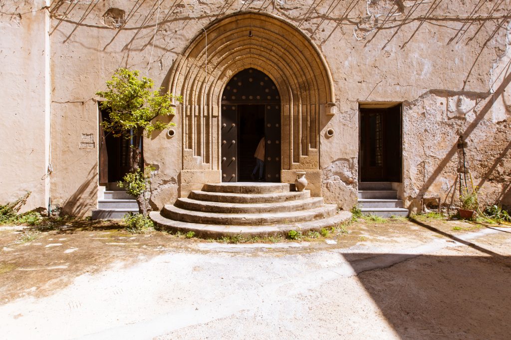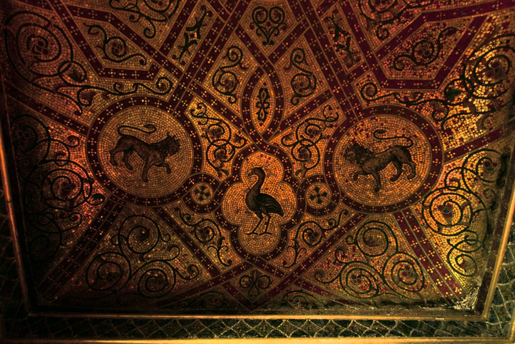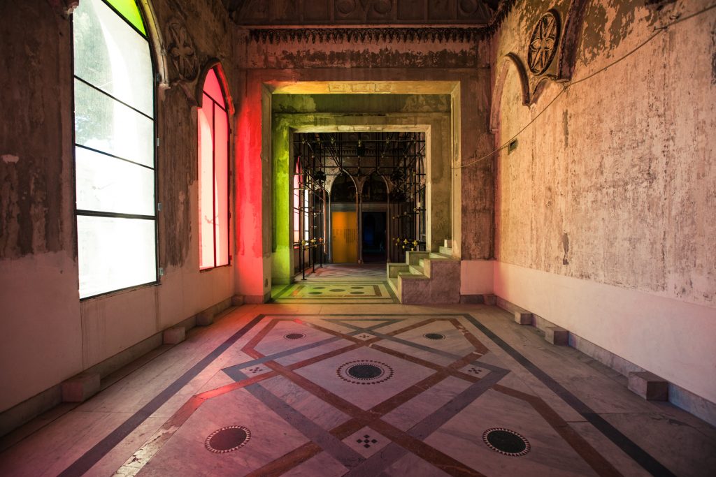 Its interior, composed of the “Sala dell’Alhambra”, octagonal room, and “Sala dei Mosaici,” were inspired by medieval art and architecture. The first two rooms reflected the Moorish style by adopting Arab decorations made of polychrome stucco, floors covered by colourful marble inlaid works, and a fountain inspired by the one located in the Alhambra gardens. The “Sala dei Mosaici” integrated reproductions of mosaics from the Arab-Norman royal palaces in Palermo and, in particular, those of King Roger’s Palatine Chapel in the Royal Palace of Palermo. With the involvement of the architect Giuseppe Patricolo, the façade on Piazza Kalsa, would adopt a neo-Gothic style through pointed-arched windows.