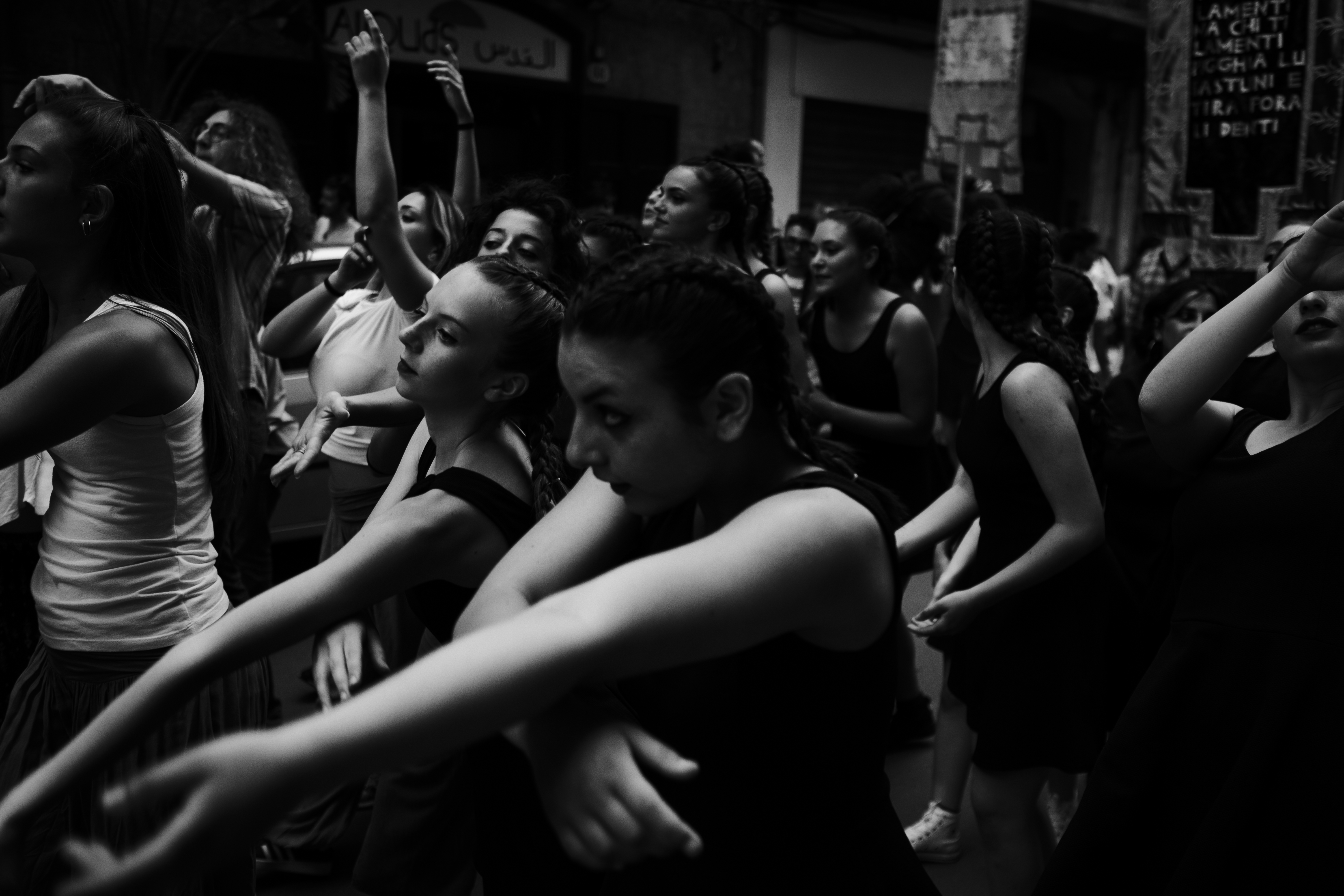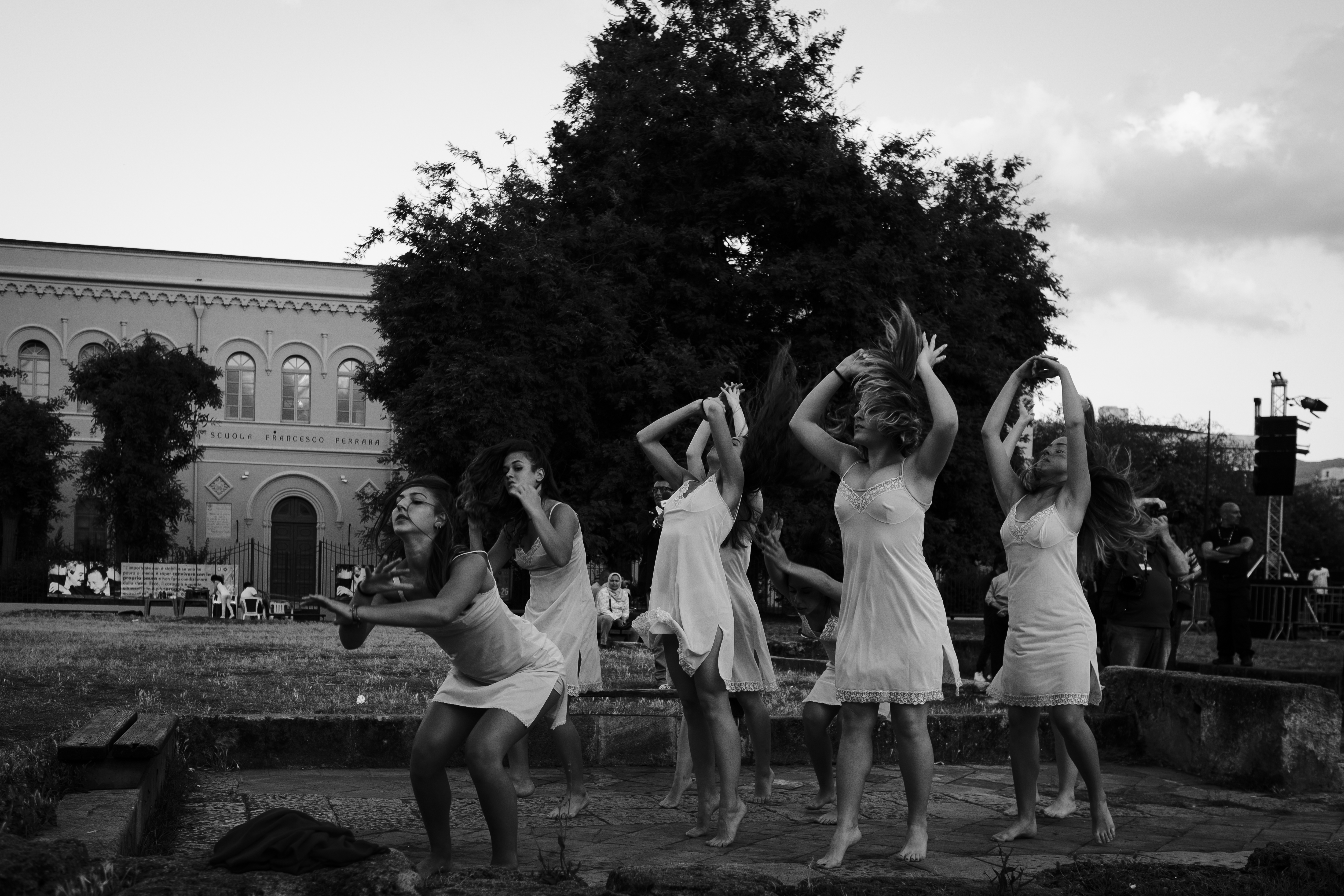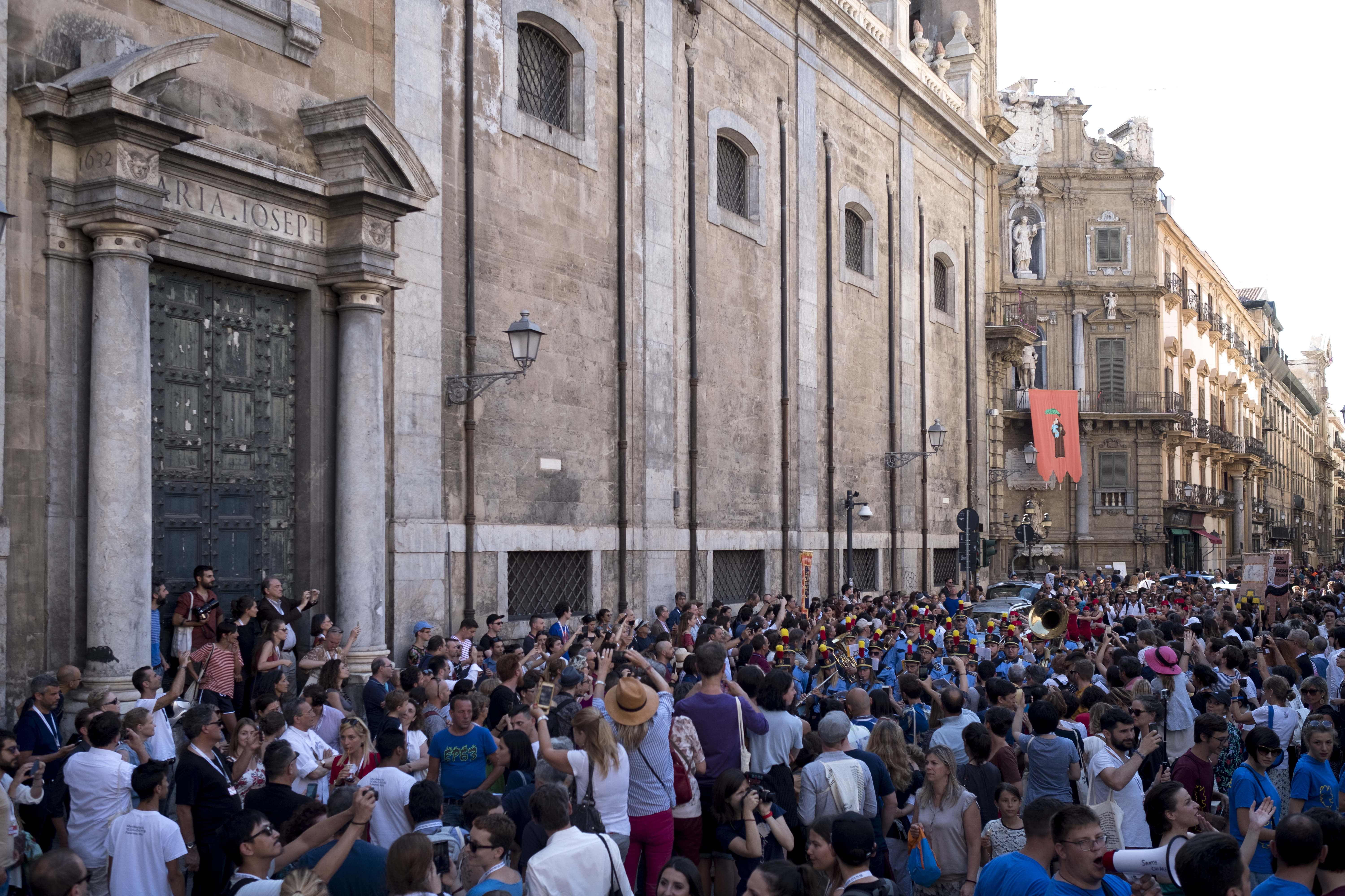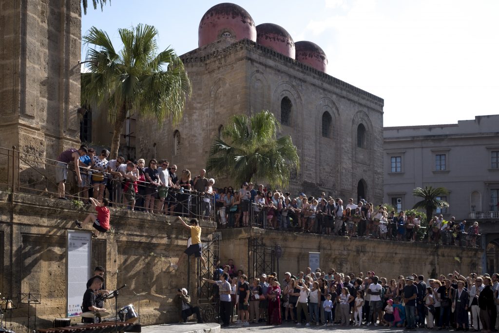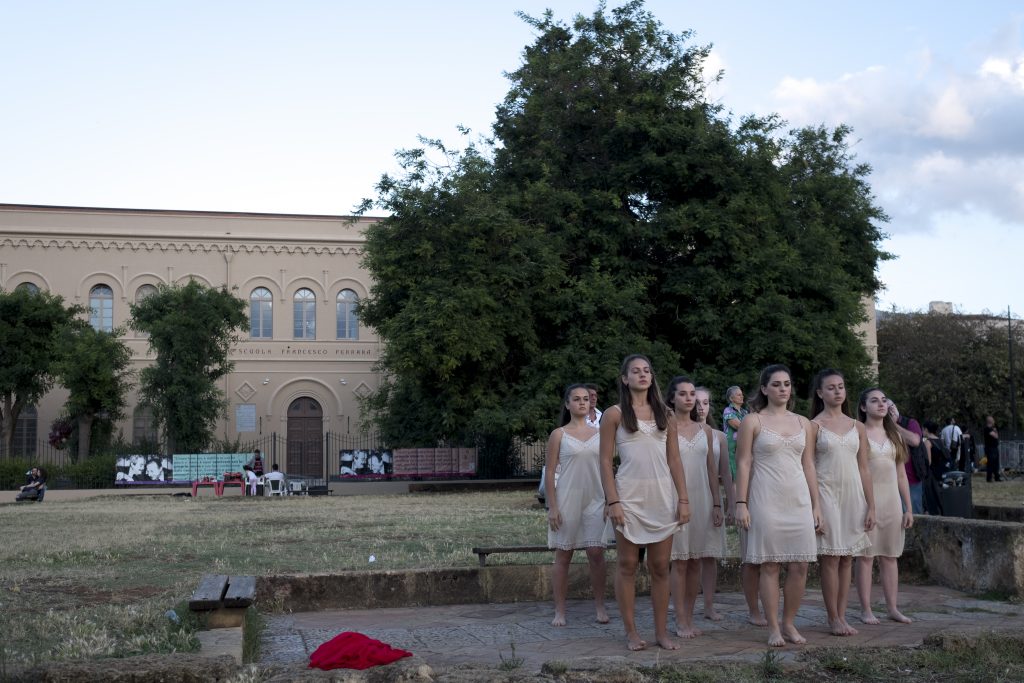 The performance Palermo Procession takes place on 16 June in the historical centre of Palermo, and the whole community is involved, from amateurs to professionals. The project focuses on the idea of narration as experience that can be explored through non-hierarchical learning, self-teaching and the creation of an active community. The procession, which sets out from Piazza Santa Chiara and arrives at the Foro Italico, reflects Palermo, a dancing city, in continuous movement. To provide a more complete vision, an exhibition at the Chiesa SS. Euno e Giuliano describes the preparatory process of participation in the procession.
