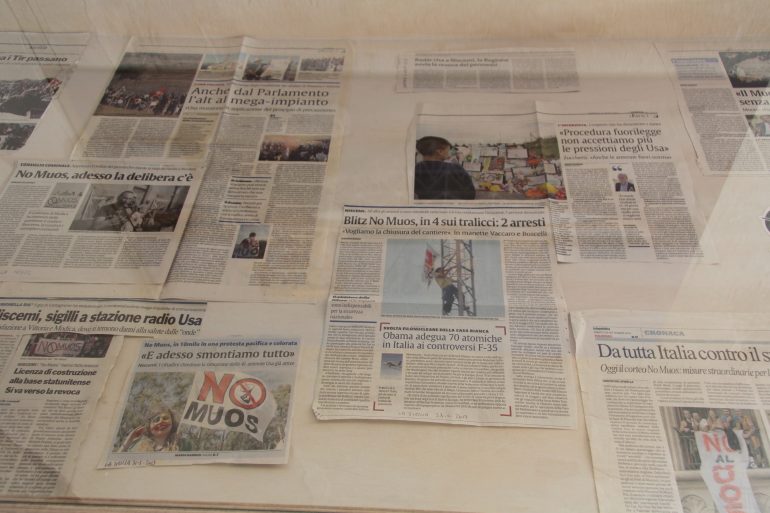 Not far from Niscemi, a town in south-east Sicily, the United States Navy has activated a new global communications system called MUOS (Mobile User Objective System) which uses a global provider to conduct remote warfare, coordinating and controlling drones and remotely piloted aircraft. In addition to its base in Sicily, the United States has established three other such bases in Hawaii, Australia, and Virginia. The decision to erect three enormous satellite dishes in Niscemi was fiercely contested by the local residents, who have fought against MUOS since 2009 due to the harmful effects of the antennae on their health and environment. The documents chosen by Tania Bruguera from the activists’ files tell the story of an ongoing battle. The project includes audio, video, and photographic documentation, organised in the form of an exhibition with the aim of giving the movement new visibility worldwide.